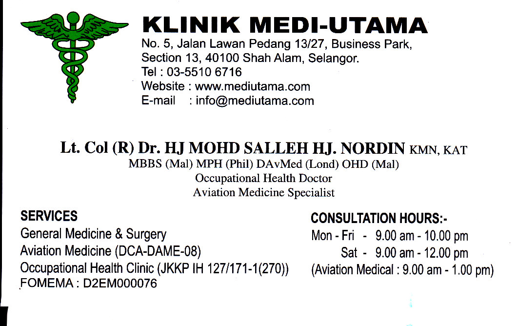 Potential students must pass a Class 2 medical examination. This examination can only be carried out by specialist aviation doctors authorised by the Department of Civil Aviation Malaysia.
